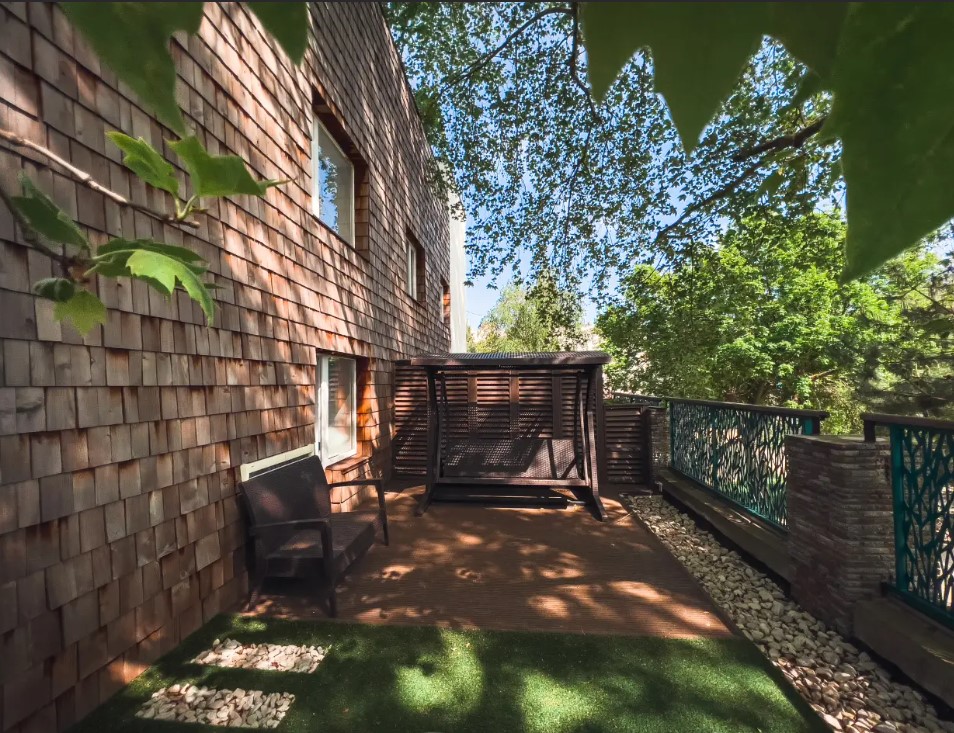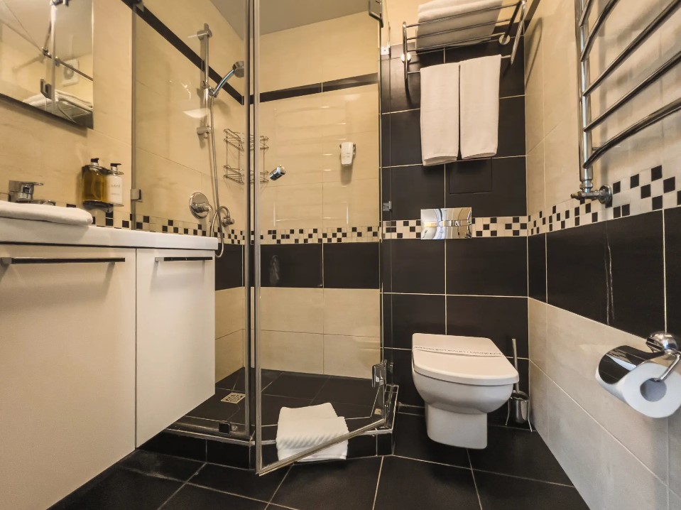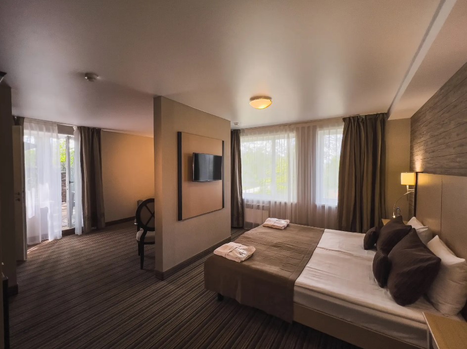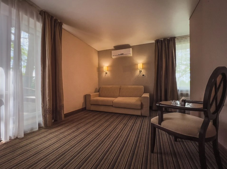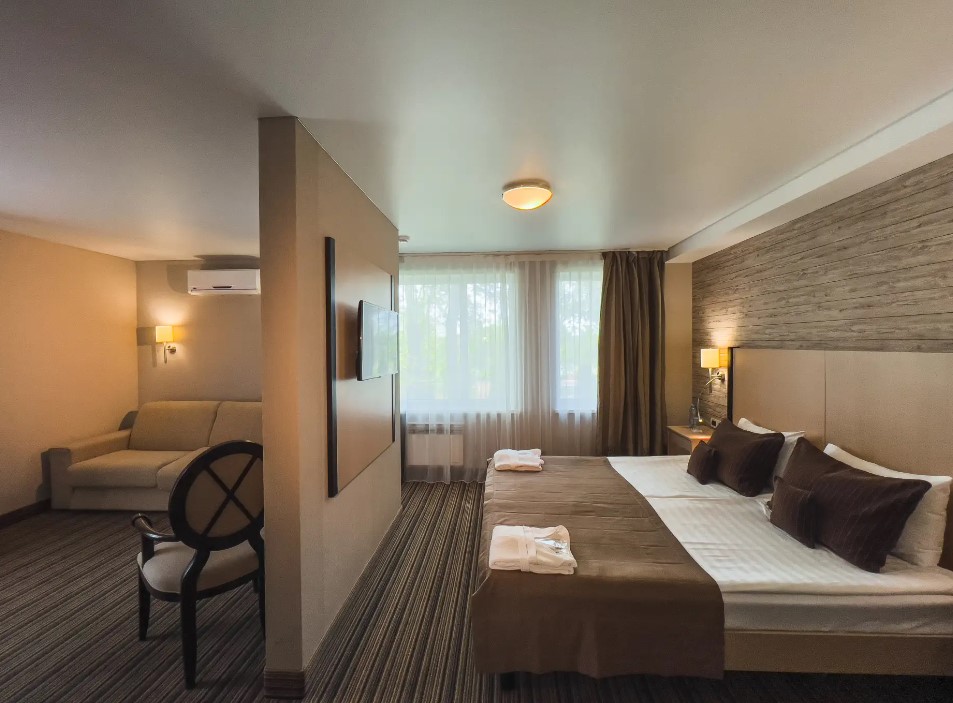 Площадь номера - 32 кв.м. 2 осн. места. 1 доп. место. Мебель: вешалка, диван, зеркало, кровать двуспальная, прикроватные тумбочки, шкаф. Оборудование: кондиционер, телевизор, холодильник, электрочайник. Санузел: с душем, туалетные принадлежности, фен. Сервис: Wi-Fi бесплатно, смена полотенец, смена постельного белья, уборка номера.