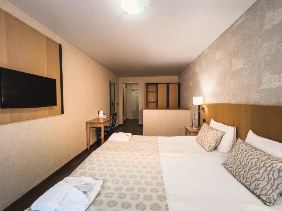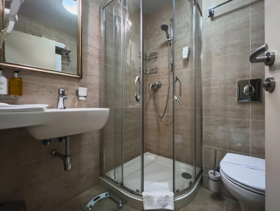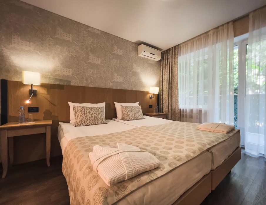 Площадь номера - 22 кв.м. 2 осн. места. 1 доп. место. Мебель: вешалка, зеркало, кровати односпальные, прикроватные тумбочки, шкаф. Оборудование: кондиционер, телевизор, холодильник, электрочайник. Санузел: с душем, туалетные принадлежности, фен. Сервис: Wi-Fi бесплатно, смена полотенец, смена постельного белья, уборка номера.