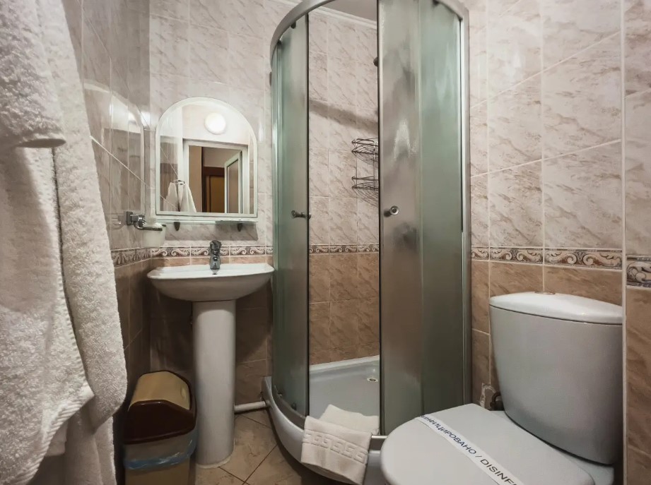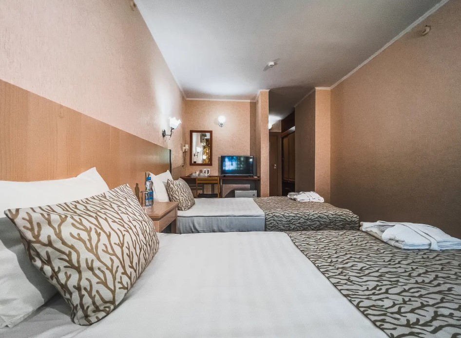 Площадь номера - 16 кв.м. 2 осн. места. 1 доп. место. Мебель: вешалка, зеркало, кровати односпальные, прикроватные тумбочки, шкаф. Оборудование: кондиционер, телевизор, холодильник, электрочайник. Санузел: с душем, туалетные принадлежности, фен. Сервис: Wi-Fi бесплатно, смена полотенец, смена постельного белья, уборка номера.