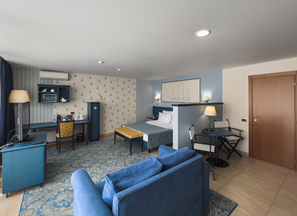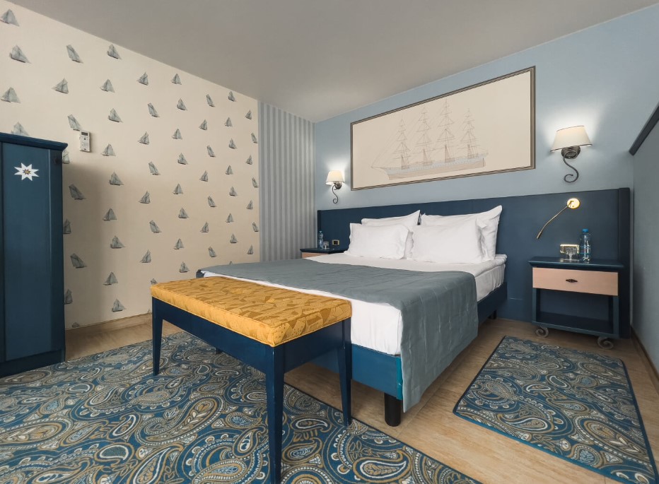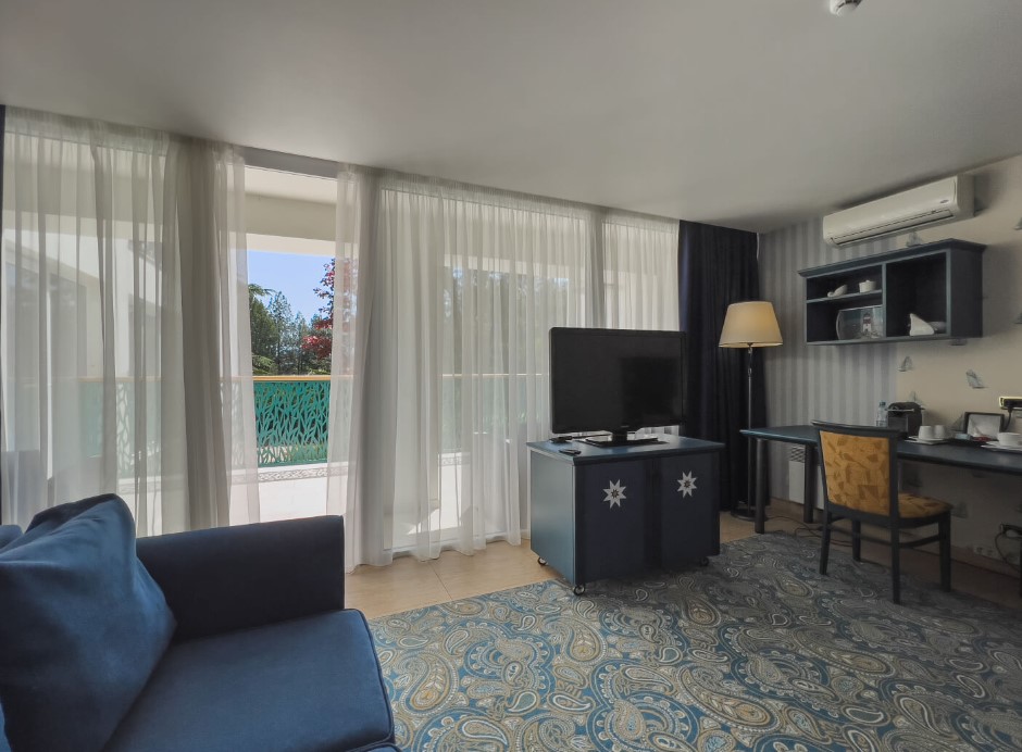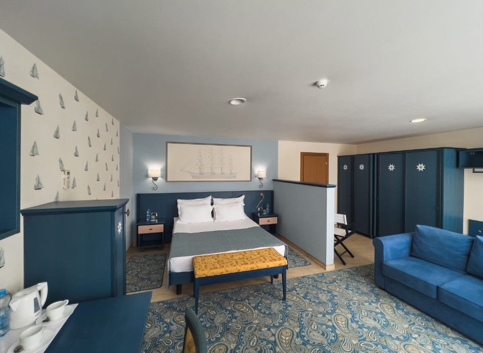 Площадь номера - 62 кв.м. 4 осн. места. 2 доп. места. Мебель: вешалка, диван, зеркало, кровать двуспальная, кровать односпальная, прикроватные тумбочки, стол, стулья, шкаф. Оборудование: кондиционер, телевизор, холодильник, электрочайник. Санузел: с душем, туалетные принадлежности, фен. Сервис: Wi-Fi бесплатно, смена полотенец, смена постельного белья, уборка номера.